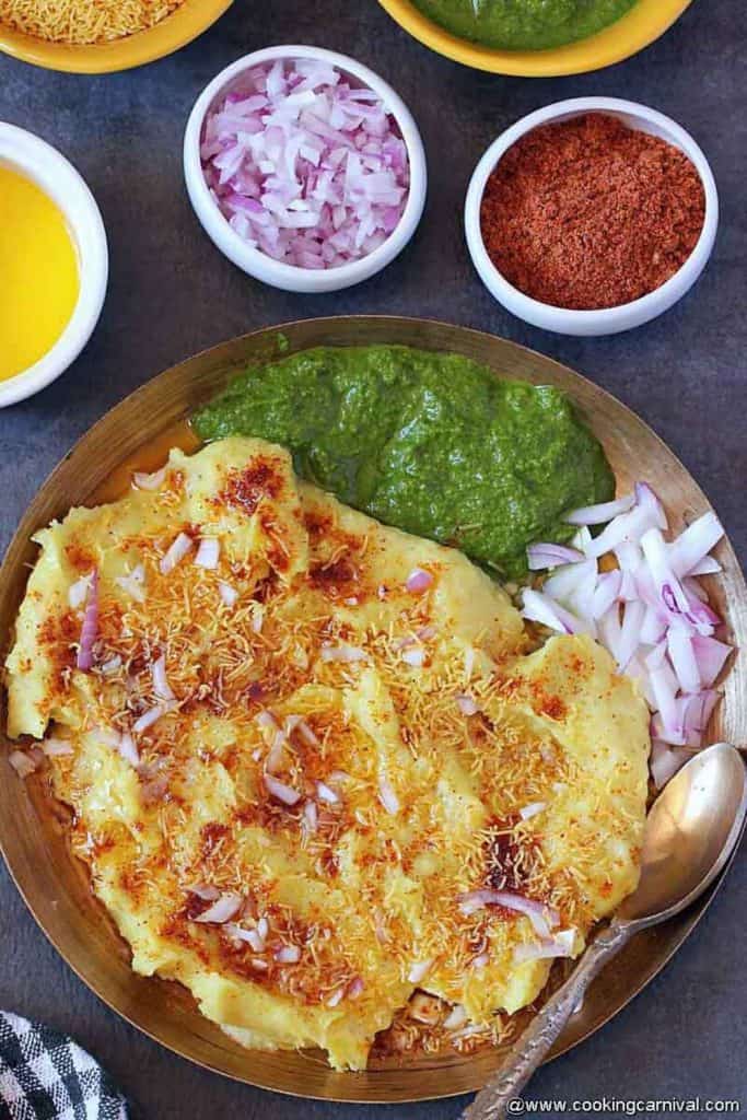 To hide his mistake, he served that dish along with the tasty and colorful toppings like green chutney, sev, onion, masala, and butter.