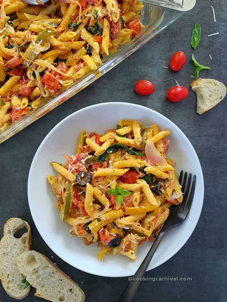 This Pasta is best served straight out of the baking dish. Leftovers can be stored in an air-tight container in the fridge for about 2 to 3 days. When reheating, add some water and reheat either on stove-top or in microwave.
