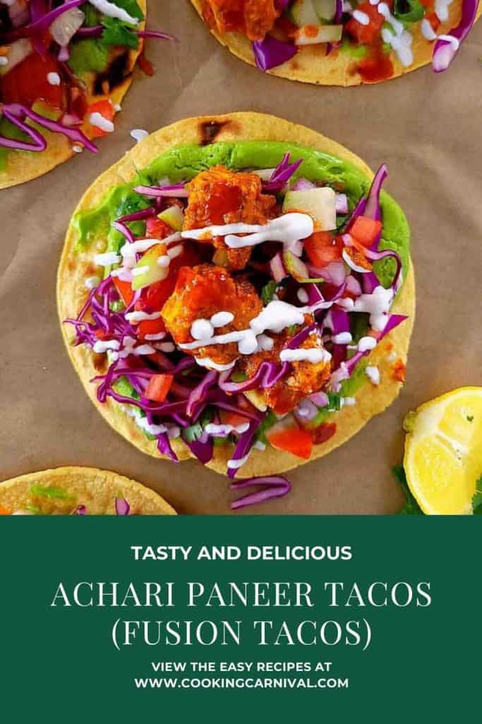 Paneer cooked in pickling spices to perfection, this Indian achari paneer is made at home and then filled in corn tortillas, topped with a delicious Spicy Green Sauce made with avocado, cilantro, mint, yogurt, and then finished with salad and hot taco sauce.