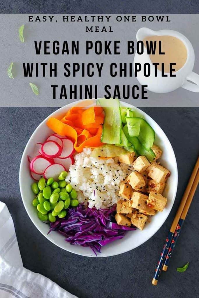 This Vegan Poke Bowl with tofu, lots of vegetables, and chipotle tahini sauce is a simple recipe. Add your preferred rice, you will have a satisfying and gorgeous-looking bowl for dinner and lunch!