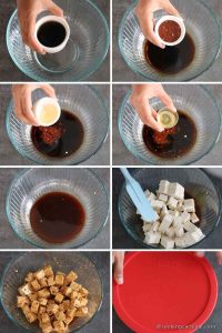 - Now add tofu, gently toss to coat, cover the bowl, and let sit for 10 minutes.