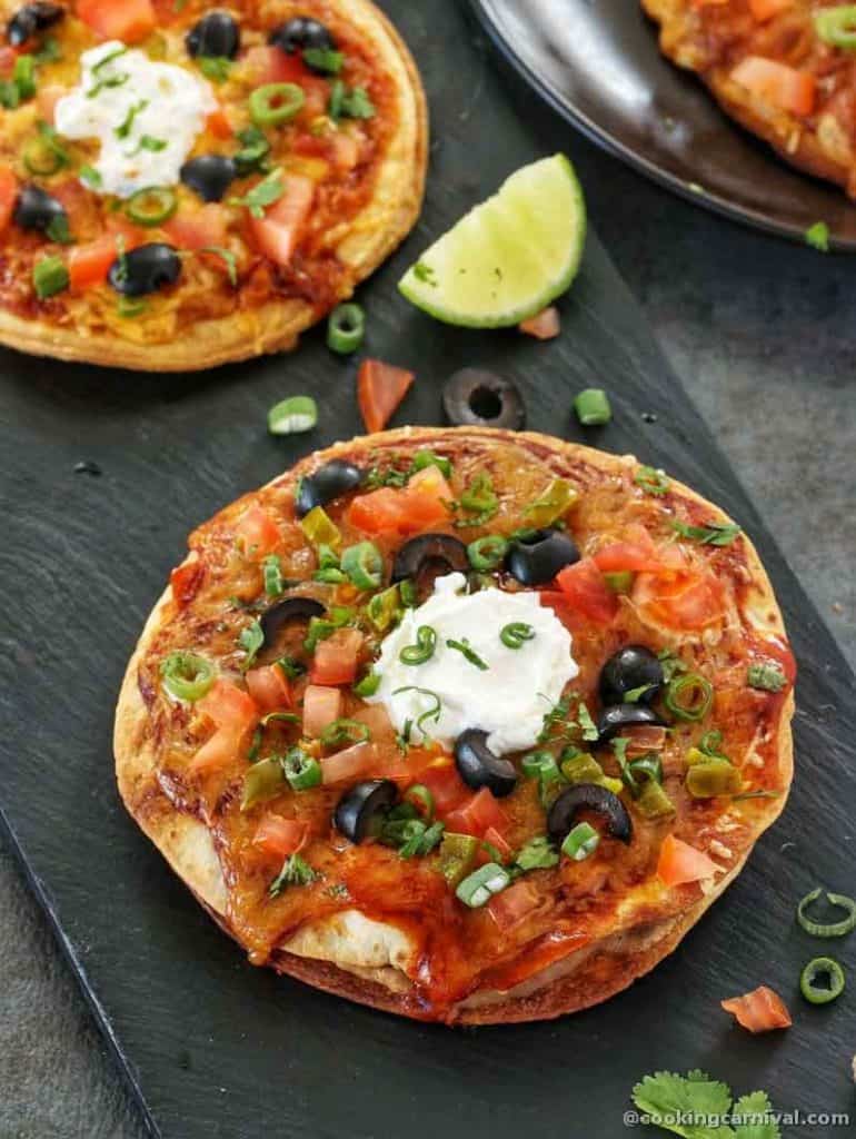 Repeat the process with the remaining tortillas. You will have 5 Mexican pizzas total.