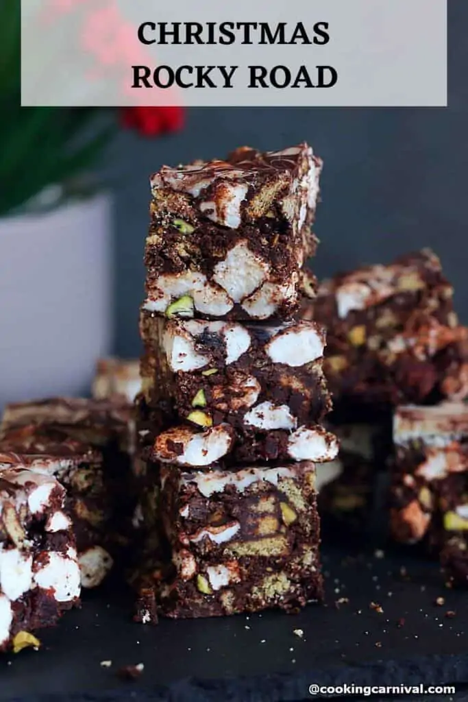 Marshmallows, pistachios, cranberries, and crackers are folded into a mixture of melted chocolate and butter to make this Christmas rocky road candy bar delicious. To make it prettier, I gave a swirly effect with white and dark chocolate.