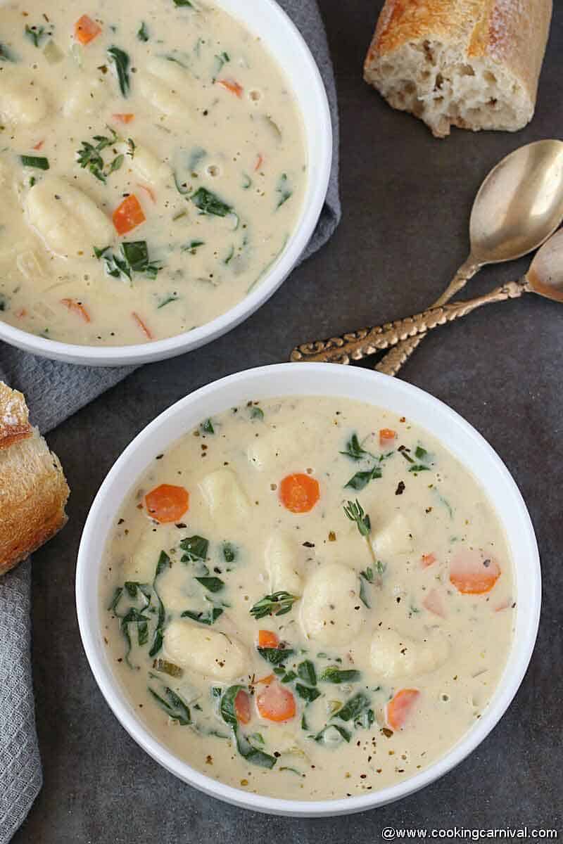 The gnocchi cooks right in the soup and the starch released from the potatoes helps to thicken it up and makes the soup smooth and hearty.