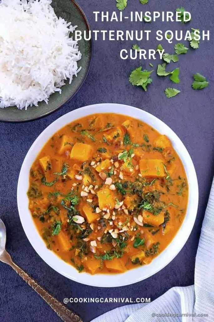 - Butternut squash curry on stove-top is ready. Garnish it with peanut and cilantro and serve it with Rice or Naan.