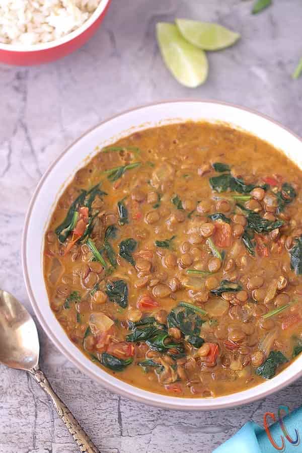 - Instant Pot Coconut Spinach Lentil Curry is ready. Garnish it with some cilantro, Now all you need is some sliced onions on the side, a squirt of lime juice some!! And you are all set!! A healthy hearty meal is ready under 30 minutes!!
