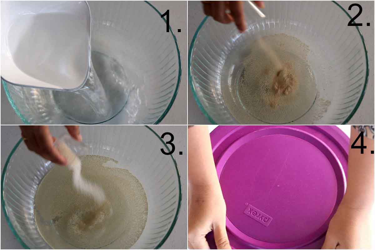 - Take Luke warm water in a large bowl, add sugar and yeast. Stir once, cover it and let it rest for 10 minutes. After 10 minutes, the yeast water should look frothy.