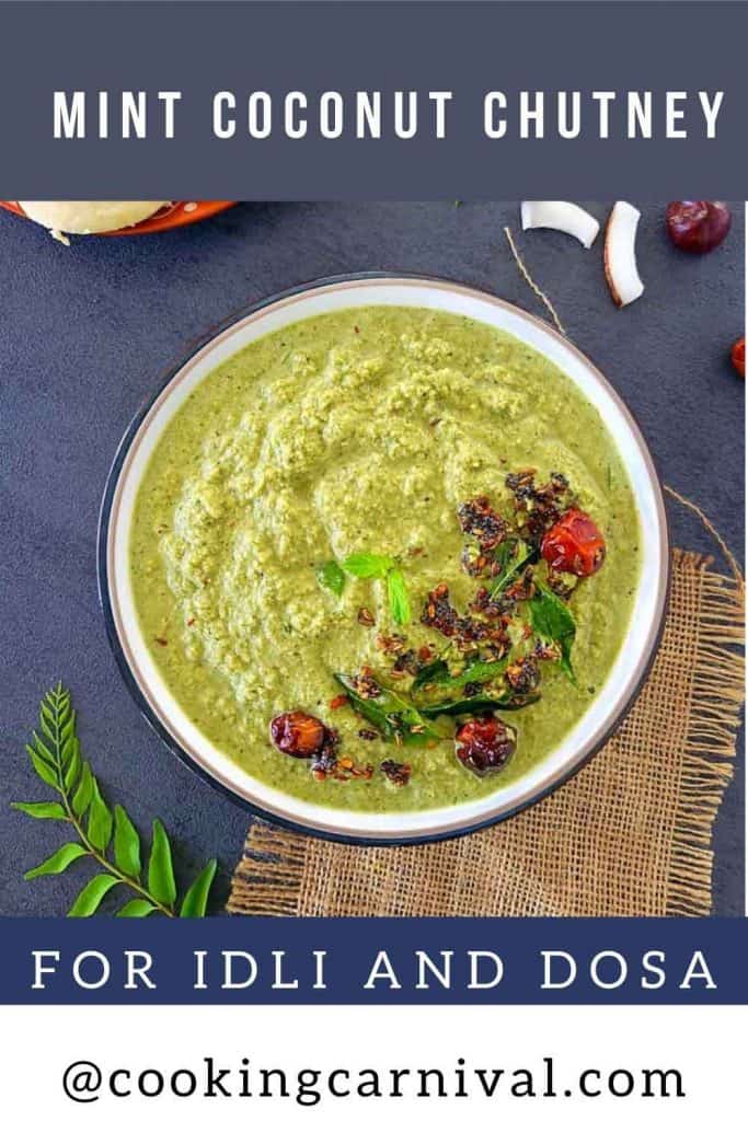 This easy South Indian Green Coconut Chutney / Mint coconut chutney makes the perfect accompaniment to idli, dosa, and uttapam! Tempered with mustard seeds, cumin seeds, hing, urad dal, and curry leaves, this mint coconut chutney is a perfect vegan dip and spread.