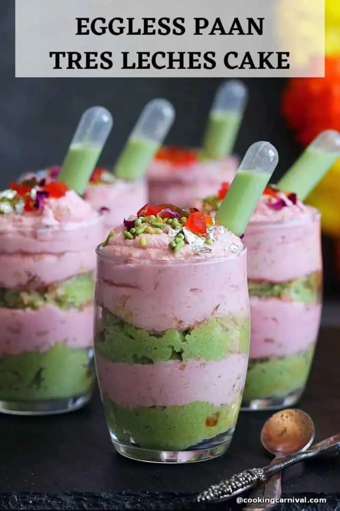Paan Tres leches Cake – eggless milk cake with flavors from paan (betel leaves), gulkand (rose petal jam), tutti fruity (candied fruit), and fennel! If you love meetha paan and are looking to add an experience to your dessert, these Paan cake jars are what you need to make!