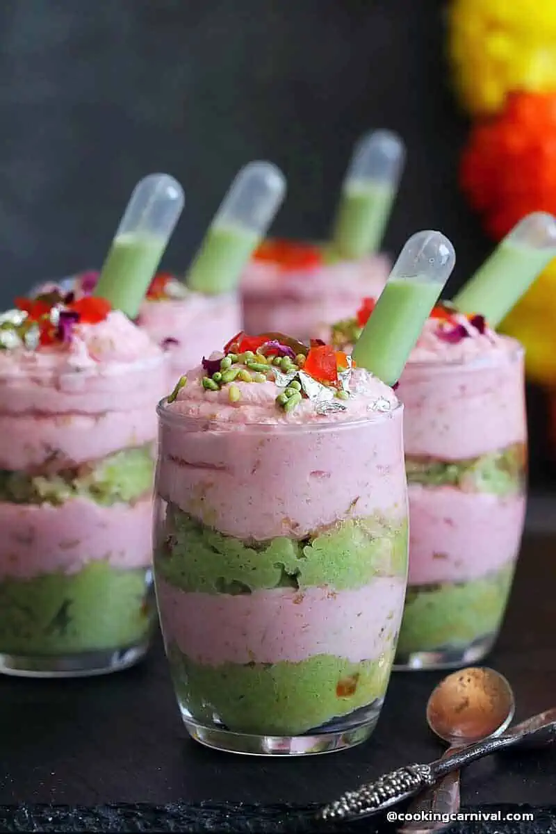- Garnish with some tutti-fruity, rose petals, fennels, rose petals, and silver varq. some falooda sev. Then place the prepared pipettes. Prepared all jars the same way.