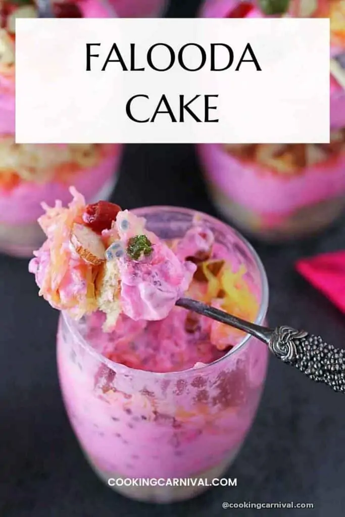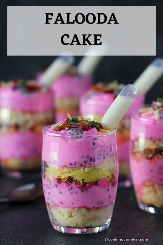 You will have rose flavors, nuts, falooda sev, cake, cream, tutti fruity, and sabja seeds in each bite. This cake is perfect for any occasion.