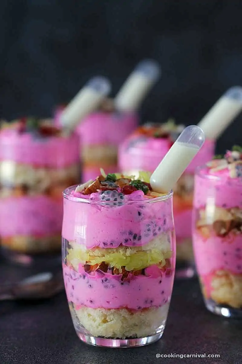 I have used 4-oz glasses here to make these Rose Falooda cake jars and I was able to get 19 jars.
