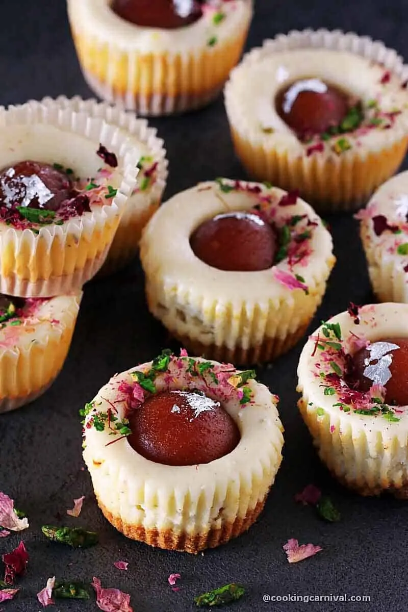 - Important Note – You will need a couple of muffin trays to make 24 Gulab Jamun cheesecake. If you have only one, you need to wait at least an hour to bake the next batch. Don’t remove baked cheesecake for at least an hour.