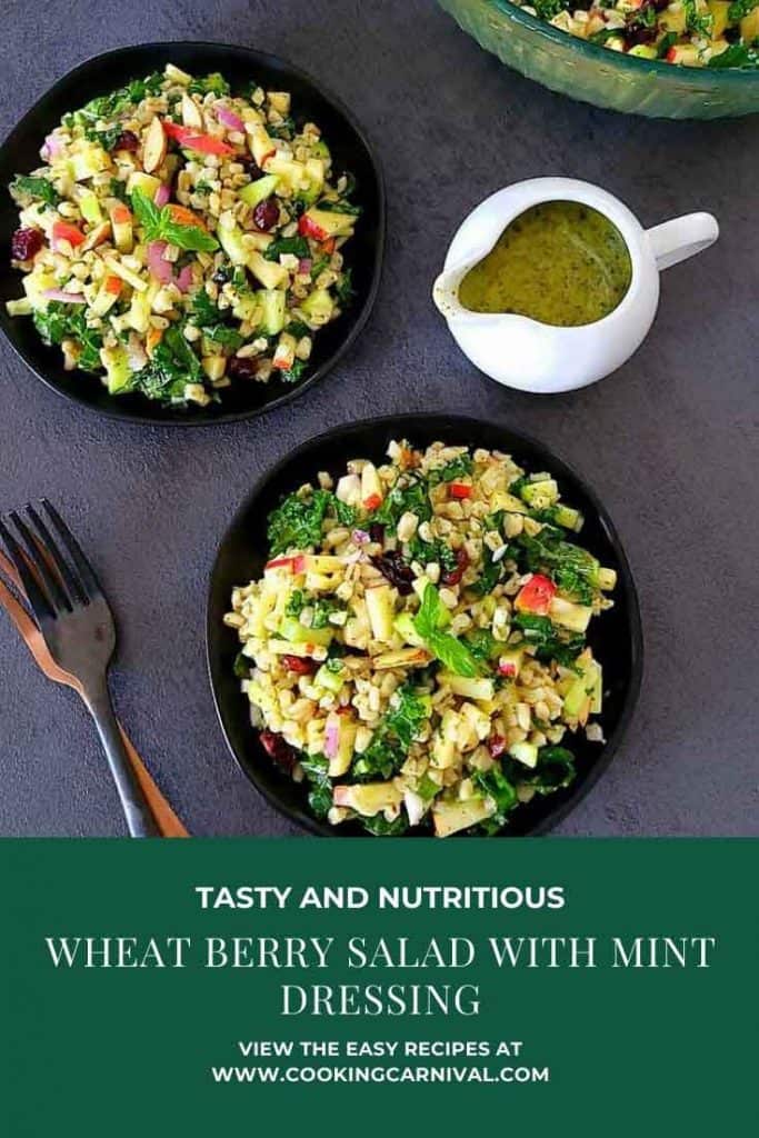 - Apple – Typically, Salads considered as a combination of vegetables. But adding fresh fruit in salads can be very delicious with added health benefits too. Apples, kale, and wheat berries pairs well in this colorful salad. The sweet and tangy mint dressing coats the apple nicely and keeps them from turning brown. You can use any type of apple. I have used Gala apple here. You can add any fruits like orange, pear, peaches, pomegranate, etc. to this salad.
