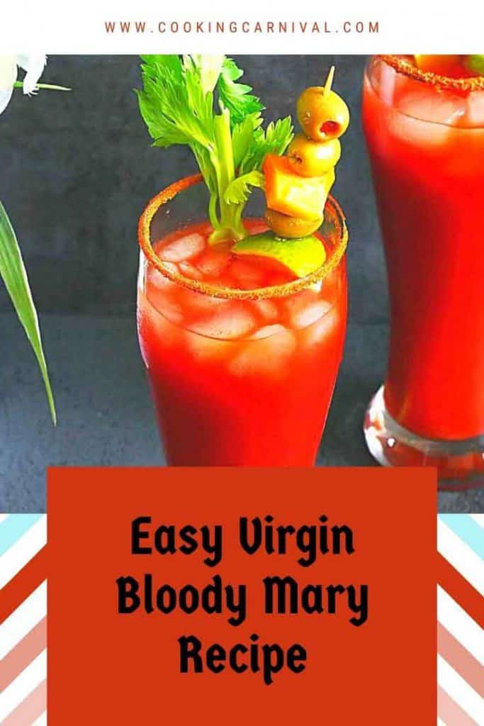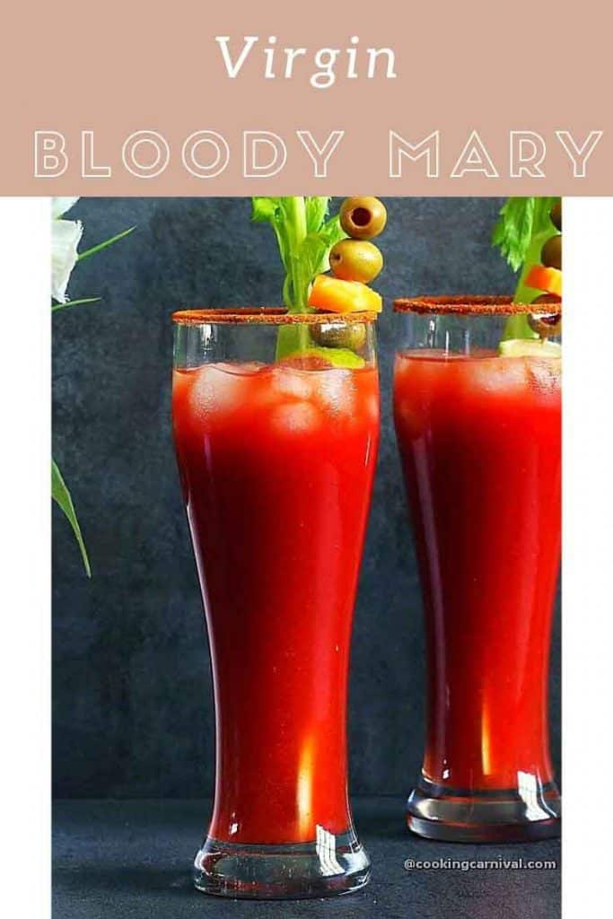 What’s the Difference Between a Virgin Mary and a Virgin Caesar? The origins of these two drinks are different. The virgin mary, a nonalcoholic version of the bloody mary, is American, whereas the virgin caesar, the nonalcoholic version of a bloody caesar, is Canadian. Additionally, the bloody mary is a tomato juice-based drink while the caesar uses Clamato juice instead. Why do add celery stick to the bloody mary? The celery is used for the garnished purpose as well as munching in between the sips. The celery helps cleans the taste in your mouth ..helping every sip of your beverage taste delicious. Is this drink healthy? This mocktail is highly nutritious! Tomato juice contains a wide variety of vitamins, minerals, and antioxidants, and is full of health benefits. How to serve this drink? The best way to serve the drink is to serve in tall glasses. And also garnish it using cocktail picks or skewers. It looks stunning and it makes the beverage easy to drink. What are other Variations we can try? This is the recipe how I and my family like. But you can experiment with additional ingredients like wasabi, fresh ginger, cayenne pepper, smoked salt, paprika, garlic powder, nutmeg, all-purpose seasoning, etc. Can we make tomato juice at home instead of buying it from the store? Sure you can. If you have the time to make juice at home, choose any variety of tomatoes of your choice. Remove the stems and use your electric blender. Strain out seeds and use them in the recipe. How to Store? Store leftovers in the refrigerator for up to a week. If you are planning on mixing up a big batch of the drink, store it in the refrigerator for up to a week in an air-tight container or jar.Nutrition