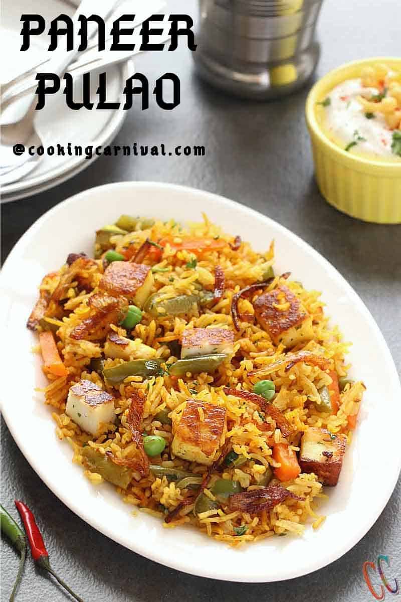 Paneer Pulao tastes best with Boondi Raita or Cucumber raita but can also be consumed with Vegetable Kurma.
