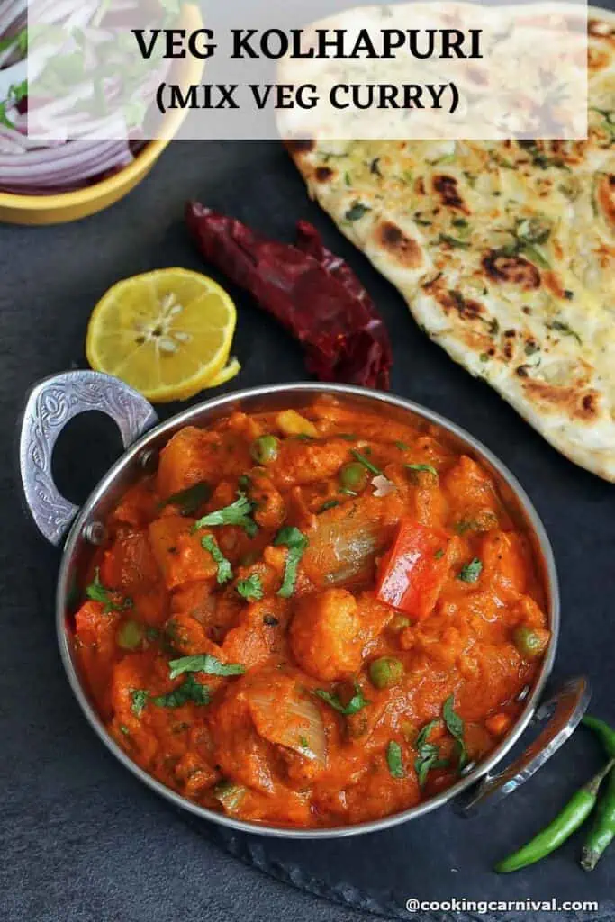 - Yummy and spicy Veg Kolhapuri is ready. Garnish it with coriander/cilantro. Serve Veg Kolhapuri with Roti, Naan, Paratha, Tandoori roti, or Kulcha.