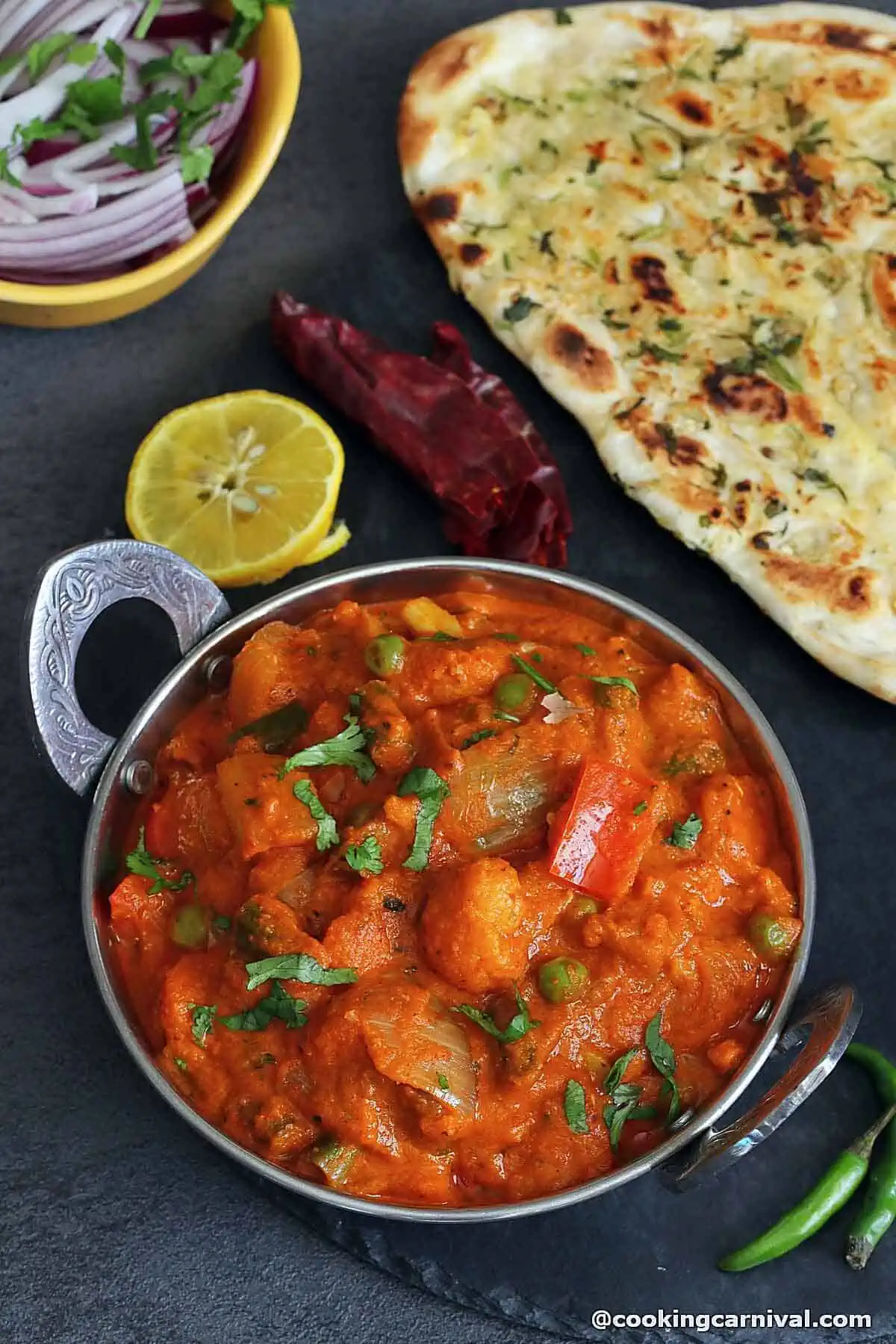 Mixed vegetables are cooked and then simmered in spicy, onion-tomato-garlicky gravy and served with Tandoori roti or garlic Naan!