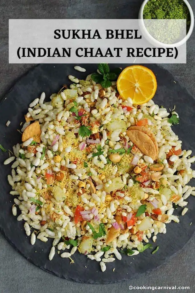 Sukha Bhel is a popular Mumbai street-style snack made with puffed rice, sev, veggies, papdi puri, and dry bhel chutney. It makes perfect tea-time snacks.