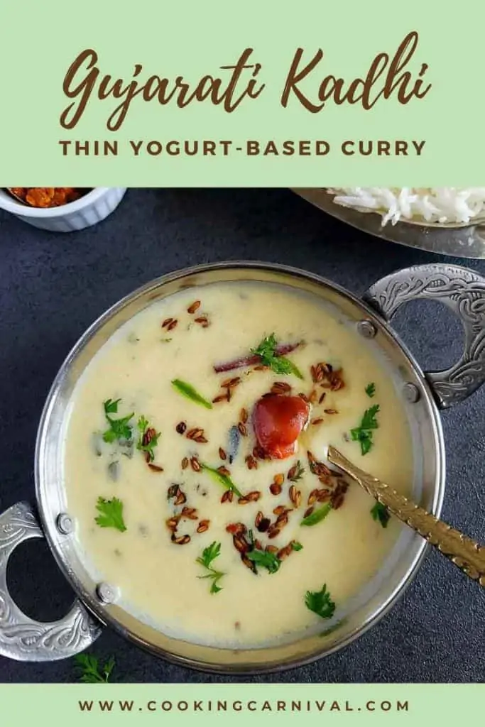 - Use full-fat yogurt to make the Gujarati Kadhi creamy. If using a low-fat curd, increase the amount of Besan to make it a little thick.