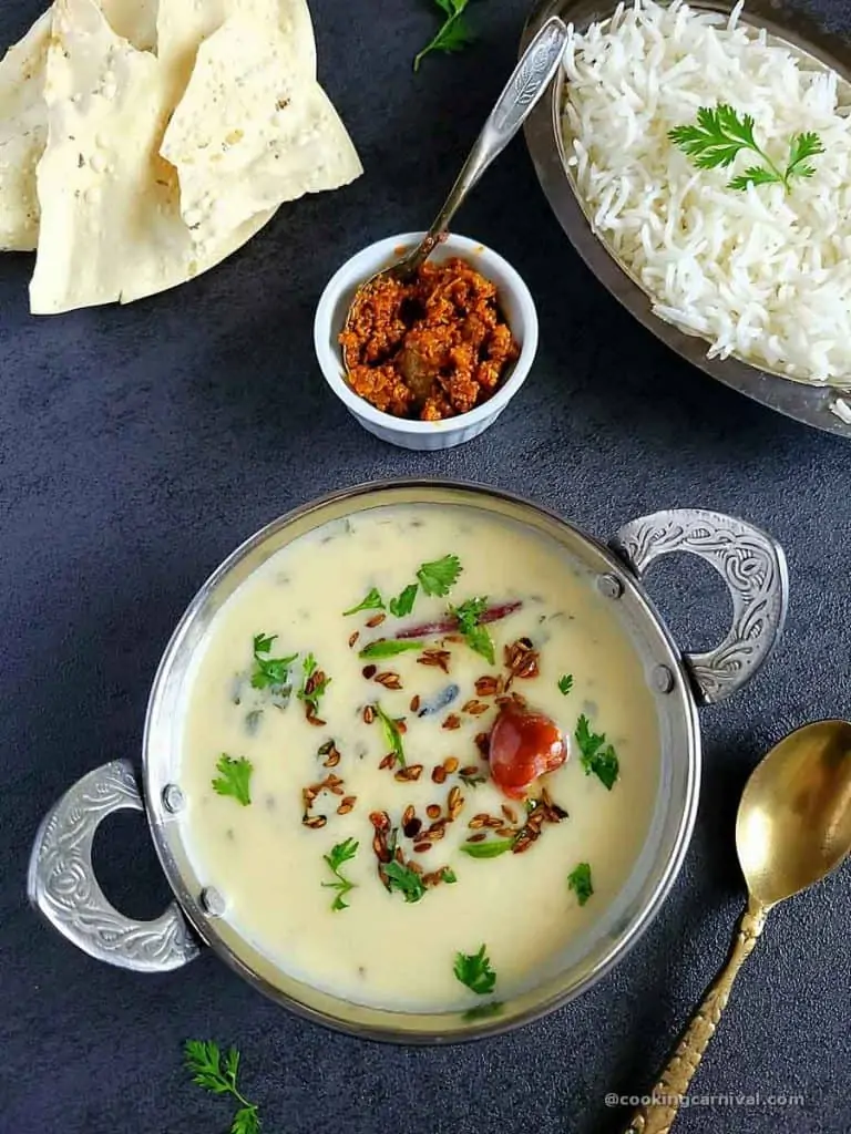 Gujarati kadhi – This is the simplest version of kadhi. It is a sweet, tangy, and spicy kadhi recipe and has more watery than the others, and also does not use turmeric.