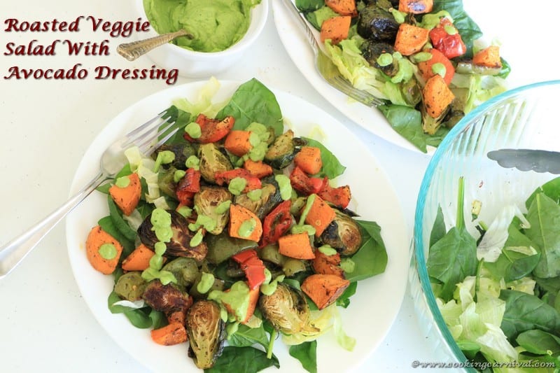 - To assemble the salad, place hand full of lettuce and spinach on a plate and top it up with roasted veggies. Drizzle on the Avocado dressing and Serve.
