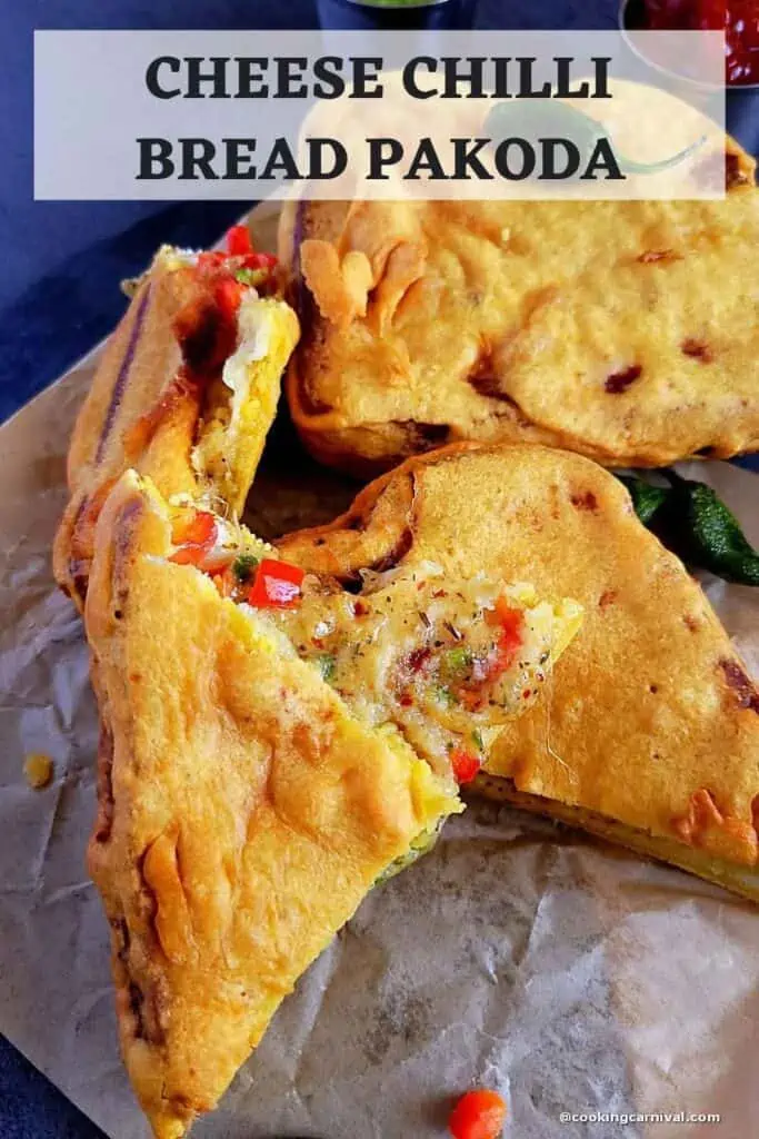 These are made by stuffing with a variety of chilies, cheese, and herbs, stuffed in bread slices, and then dipping bread slices (squares or triangles) in a gram flour batter. And then deep frying them until golden and crispy. So good!