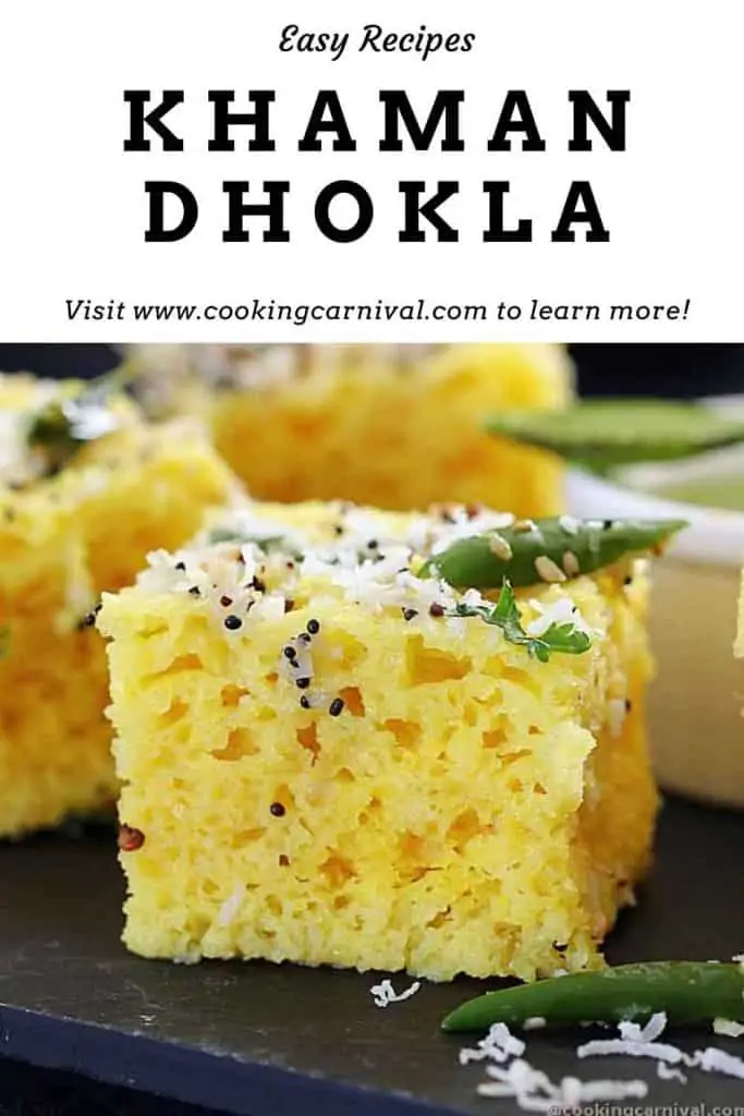 Khaman Dhokla is a Vegetarian steamed savory snack recipe that originates from the Indian State of Gujarat. It is made with a batter of besan and a leavening agent. The texture is very soft, fluffy, and mouth melting.