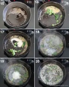 - Heat the oil in a pan. Add mustard seeds, and cumin seeds and let them splutter. Add curry leaves, green chilies, sesame seeds, hing, water, sugar, and coconut. Mix them well and let them boil for 1 minute on medium flame. Switch off the flame and let the tempering cool down a bit. (image 15 to 20)Note – Be careful while adding water as the mixture sizzles.