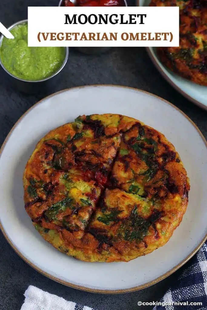 It is an easy Indian-style vegetarian omelet made with mung or moong lentils that can be whipped up quickly once the lentils are soaked.