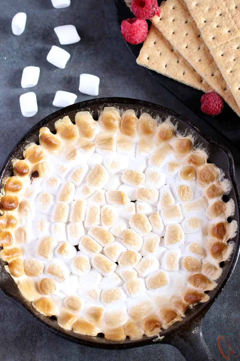 Making Smore dip is pretty easy. All you need to do is, layer the crushed graham crackers, Chocolate chips and Marshmallows in a hot cast iron pan and Place it into the oven for 7 to 8 minutes @450 degree F. or until marshmallows are golden brown all over.