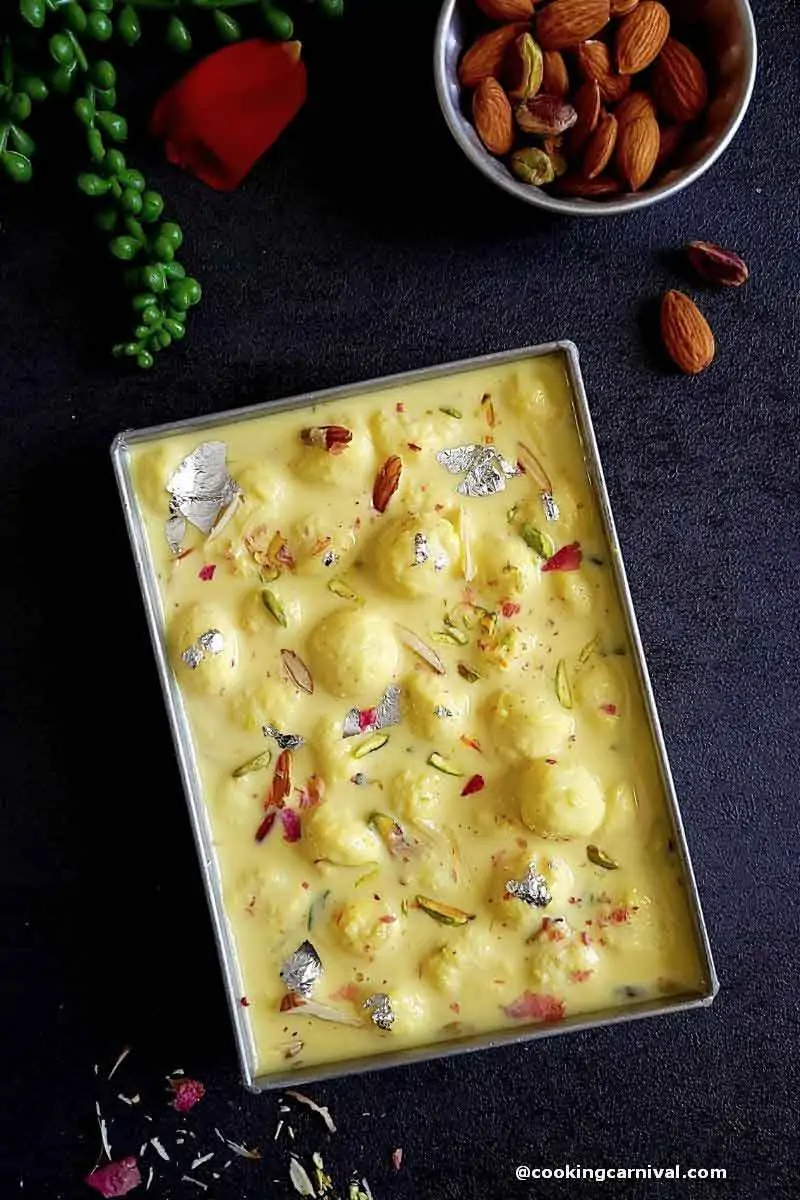 Another way to make the process easy is – You can also make the rasgulla (angoor) a day or two before and then later make the rabdi and then dunk the rasgulla.