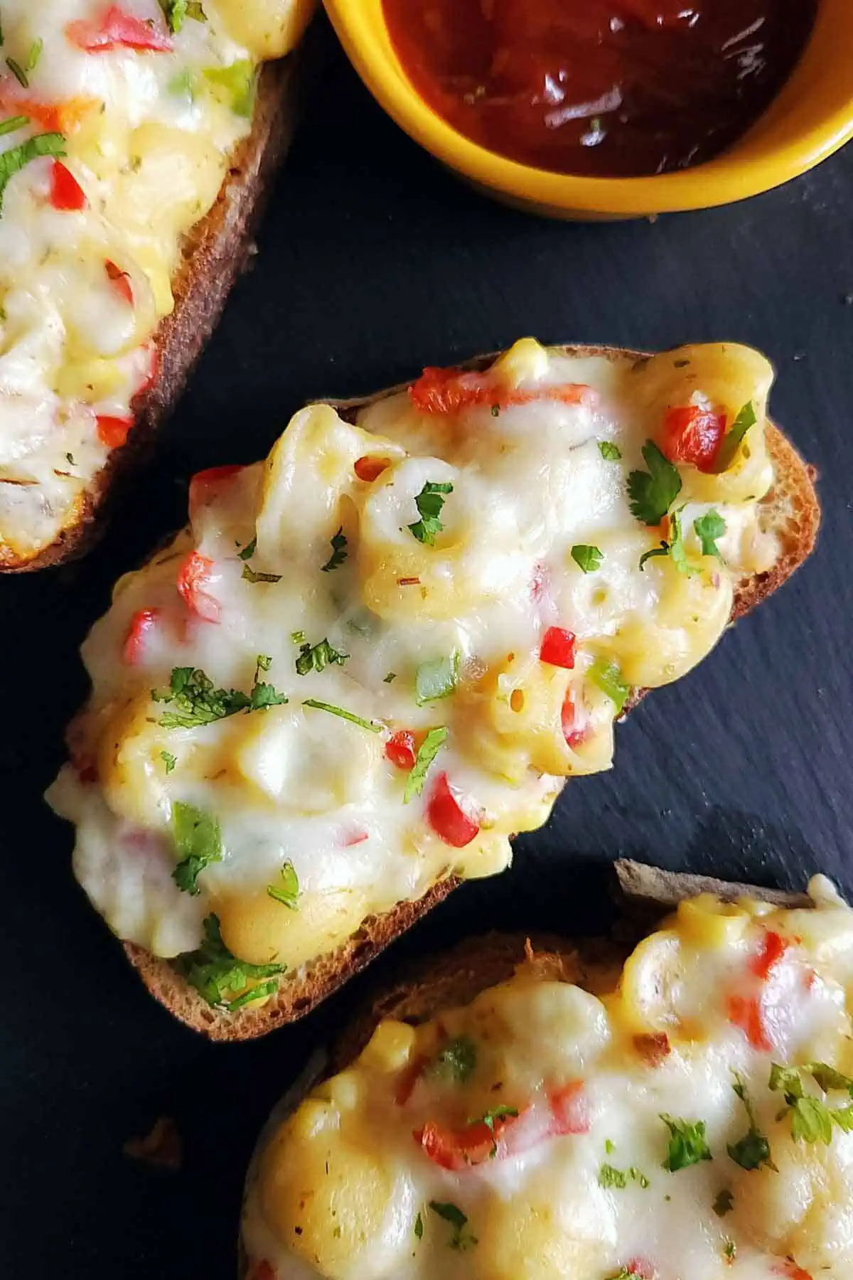 This sandwich, or toast, is made with Sourdough bread, corn, pasta, bell pepper, white sauce, and cheese. Serve it with any time of the day, snack, or kid’s lunchbox.