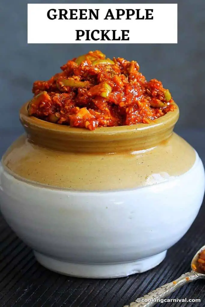 This green apple pickle can be an excellent substitute for raw mango pickle. Raw mangoes are difficult to find during winter, and this spicy apple pickle is a great alternative.