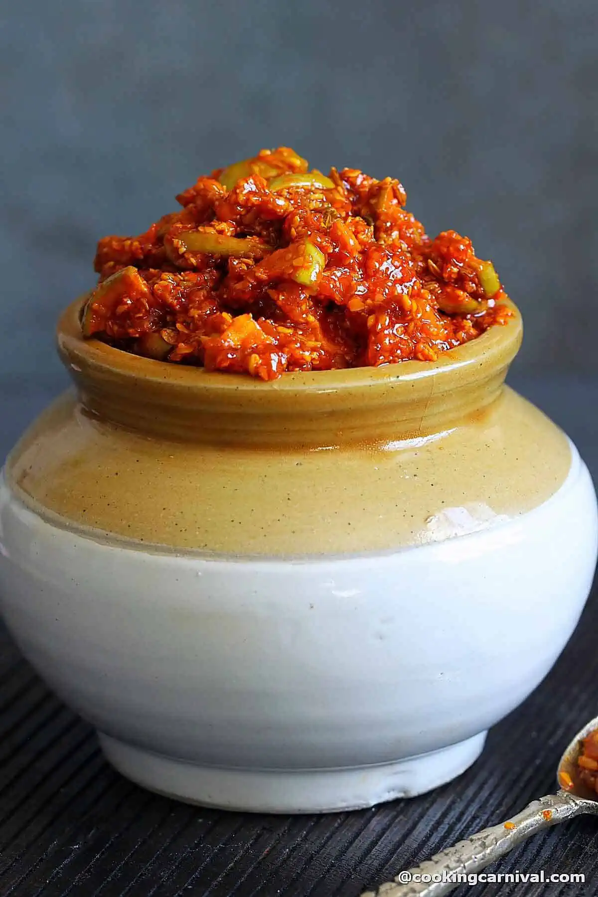 - Let the pickle masala cool down completely before adding the apple pieces.