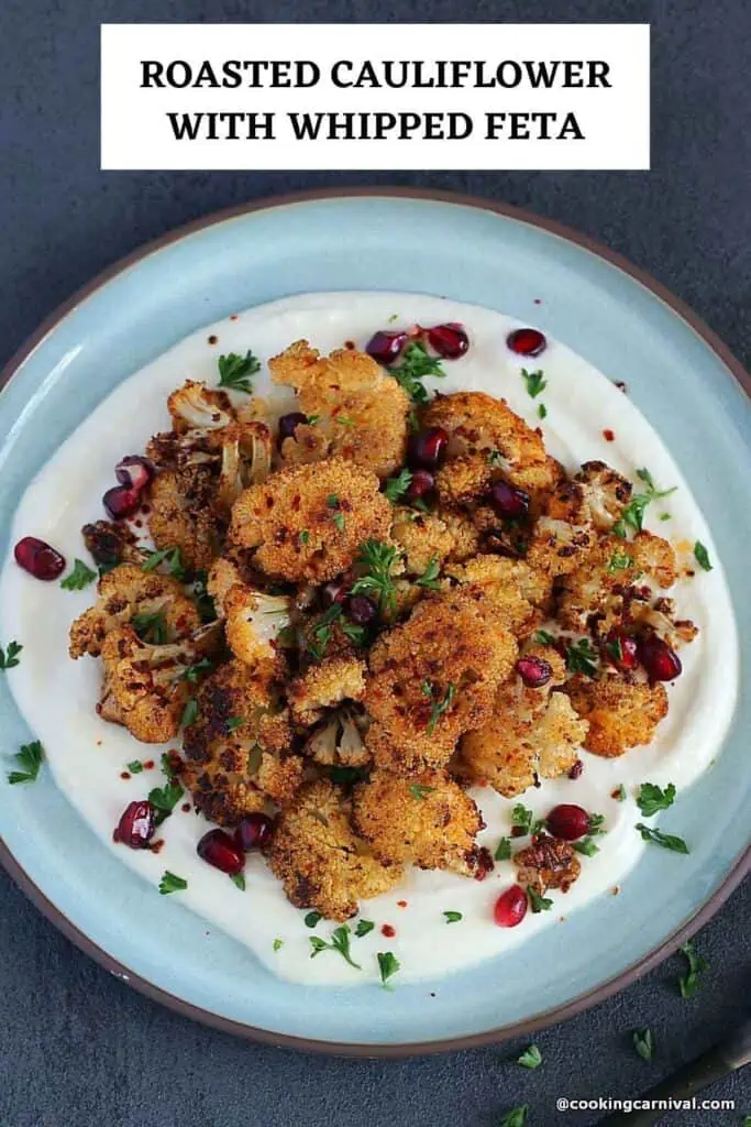 - Once the whipped feta is done, spread it across a plate. Then, once the cauliflower is done, remove them from the oven and add them to the whipped feta. Garnish it with some chopped fresh parsley and pomegranate arils, if desired. Then, serve and enjoy!