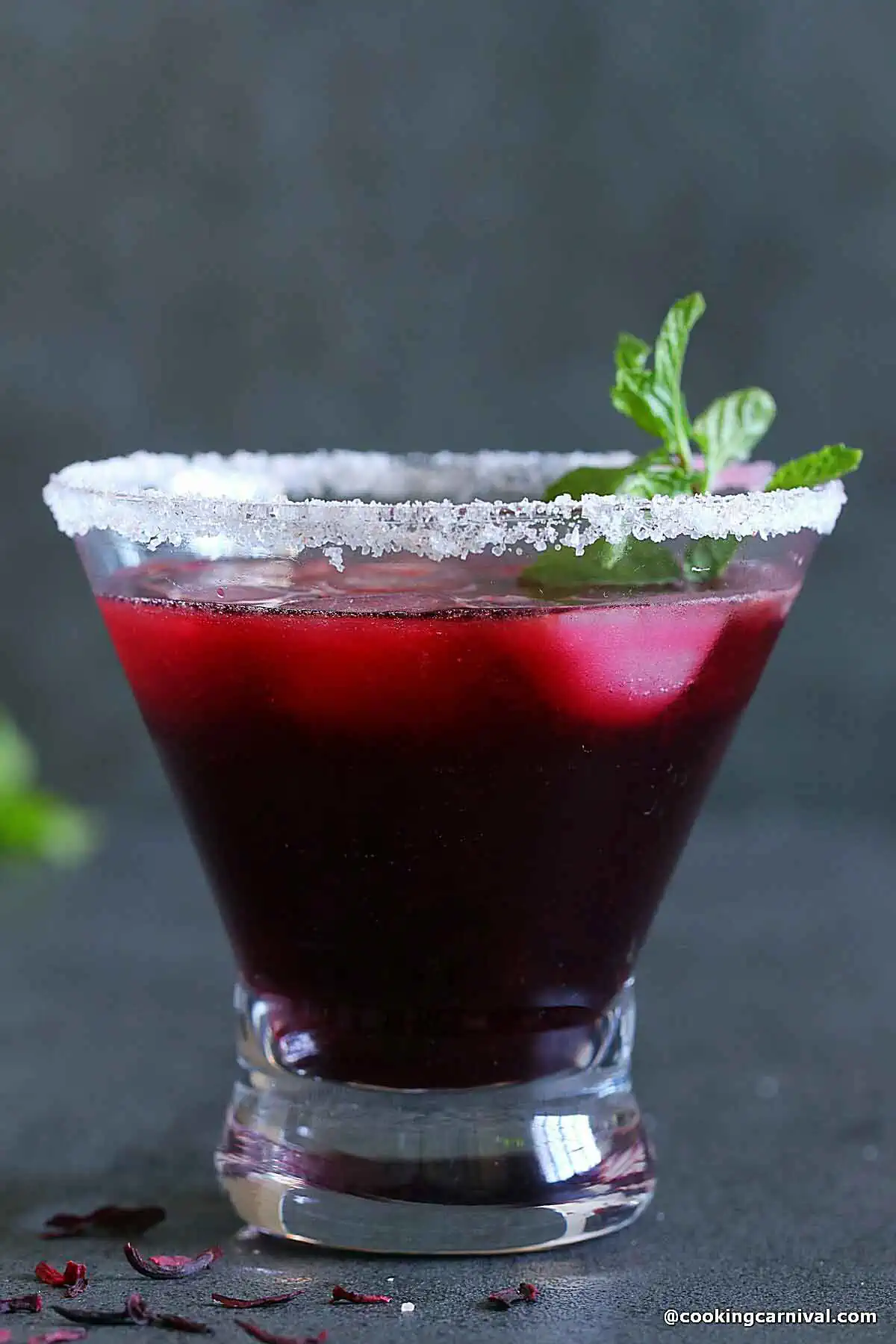 - Add some ice cubs to the salt-rimmed glass, pour the 2 tablespoon hibiscus flower simple syrup, and add 2 tablespoon orange juice in each glass.