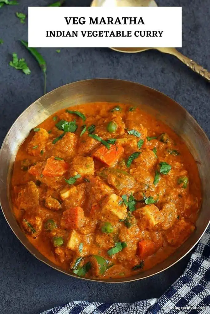 The name Veg Maratha comes from the fact that this dish uses a lot of vegetables and also includes classic Maharashtrian ingredients like sesame seeds, dried coconut, and poppy seeds. The gravy has a similar taste to traditional Maharashtrian cuisine, which is why it is called Maratha.